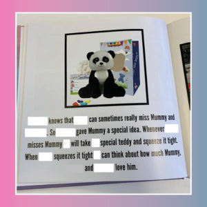 We also created a bespoke photo book to explain what was happening. It has pictures of her baby brother, at the hospital and with the doctors; a page about what happens when mummy is not there, and one on what to do if you miss mummy, which shows a picture of a teddy bear. We sent her the same bear which plays a recording of mummy’s voice saying ‘I love you’. She reads her ‘special’ book about three times a day and loves it.